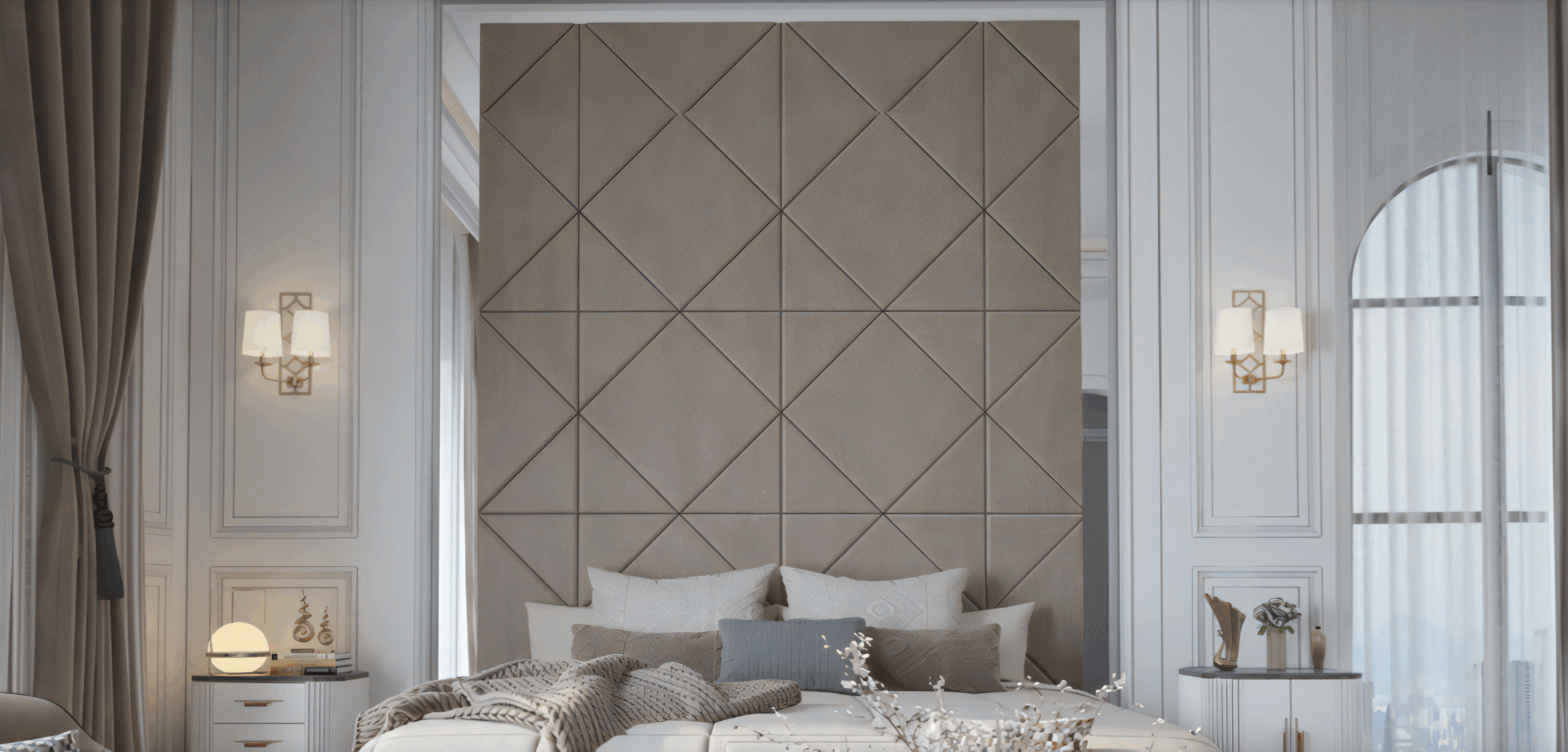 Our client envisioned a warm, transitional master bedroom. We created a custom faux leather headboard with mirrored wall trim, enhanced with pot lights, wall sconces, neutral bedding, and elegant bedside tables—making the headboard the room’s standout feature.