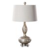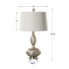 Smoked mercury glass accented with brushed nickel metal details. The tapered round hardback shade is a light beige linen fabric. Packed 2 per box.